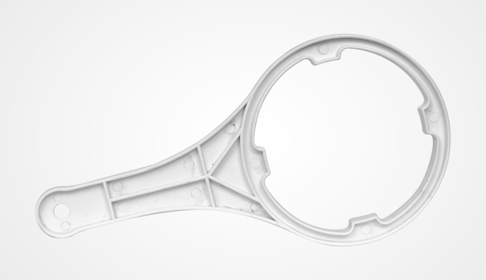 A durable plastic spanner used for opening and tightening pre-filter bowls in RO systems.